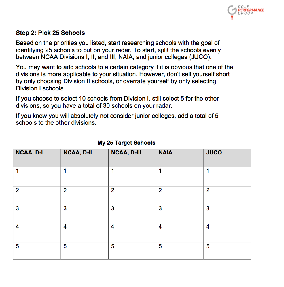 A simple process to target schools that fit your situation. Keep it balanced, identify schools that you have a good chance to qualify for while also pursuing schools that are realistic if you continue to improve your golf and academic situation.